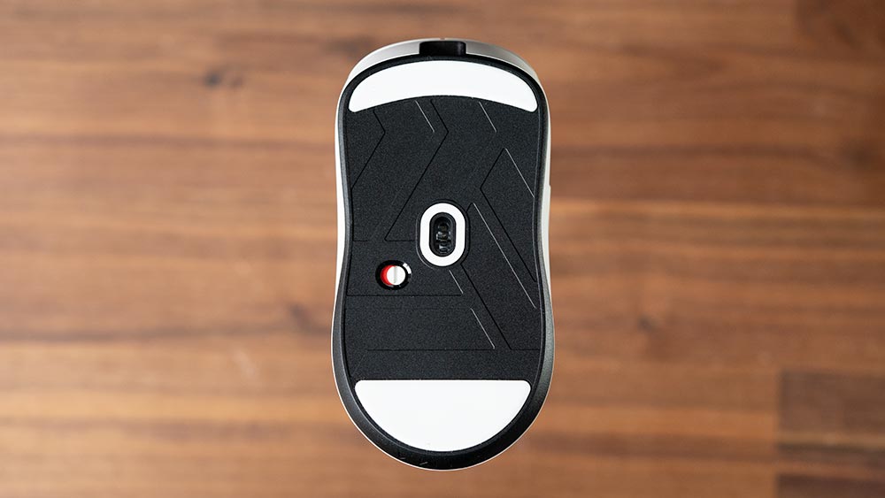 センサー位置はややフロント寄りです。フロントセンサーだと手首を横方向に振ったときのカーソル移動幅が大きくなります。このマウスはほんとにややって感じですが、今使っているマウスのセンサー位置次第では感覚が変わる可能性もあるので心に留めておきましょう。
