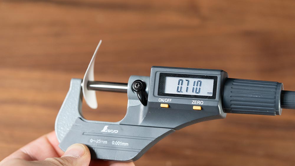 ソールの厚みは0.71mmほどでした。しっかりめのソールなので丁寧に剥がしてあげればギリ再利用可能です。さらに軽くすることも考えてドットソールに張り替えちゃうのが吉かなとは思いますが。