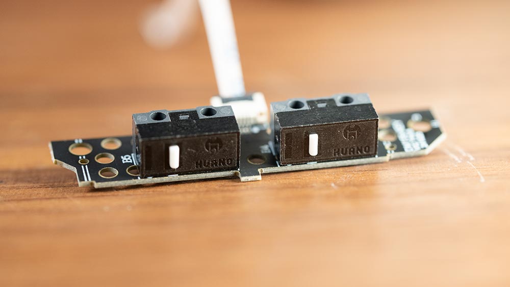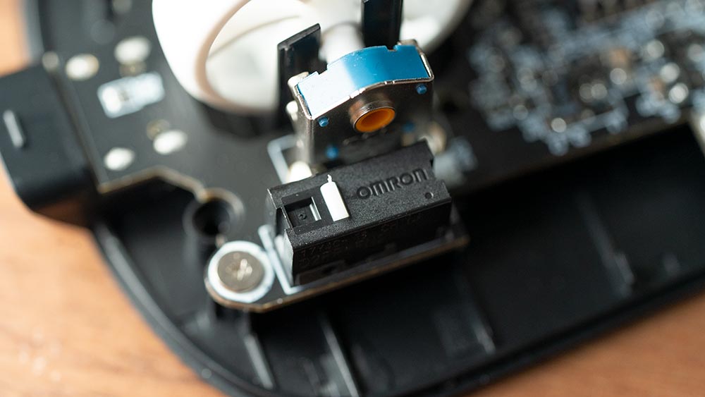 メインスイッチはOmronオプティカル。個人的に昔からこのスイッチが発するキュピキュピみたいな甲高い音が好きじゃなくて敬遠していましたが、本マウスでは組み込み方が上手いのか悪くないと感じました。というか全然アリ。