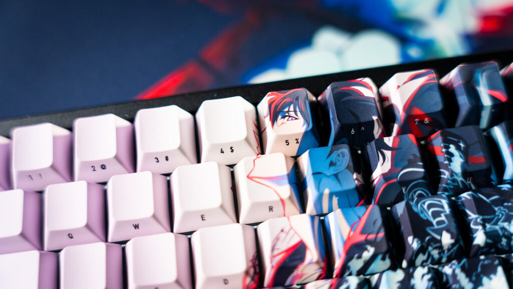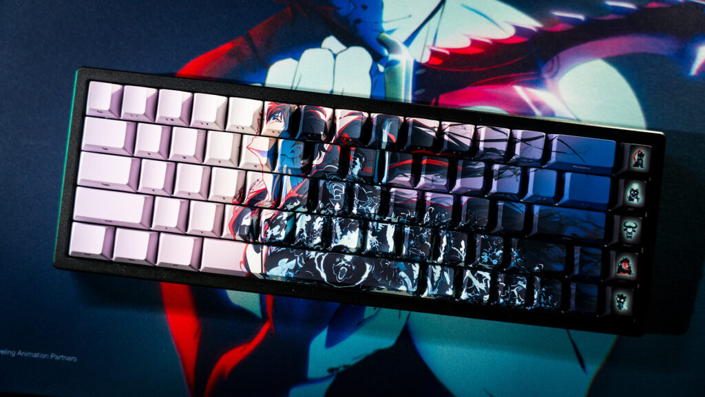 キーボードはAMICIS 65HE。アルミ筐体にFR4プレート、サンドイッチマウント構造を採用し、打鍵感・打鍵音ともに上質です。0.005mm対応のラピトリや8kポーリングレートなど、性能面でもハイエンドクラス。デザイン性だけでなく、ゲーマーが本気で使えるレベルの完成度でした。