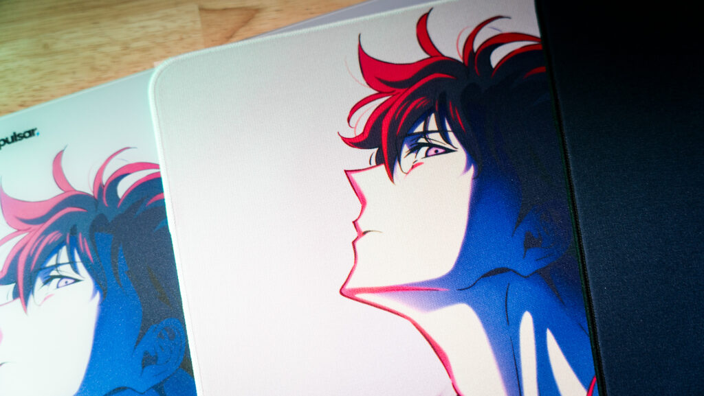 一方、布製マウスパッドも侮れません。第1期と第2期のビジュアルを用いた2種類があり、素材はポリエステル。滑りはバランスタイプで、初動が軽く、コントロール性とスピードの両立が取れています。ステッチも丁寧で、手首への干渉も少なく、吸着力の高いボトムが安定した操作を支えてくれます。