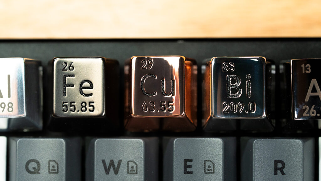 Awekeys Periodic Tableは、メタル素材の存在感と遊び心を両立したキーキャップセット。周期表をモチーフにしたデザインは非常にユニークで、机上に並べるだけでもちょっとしたアートピースのようです。