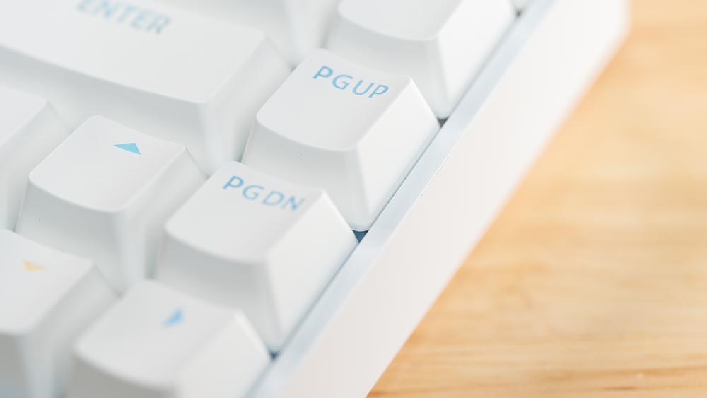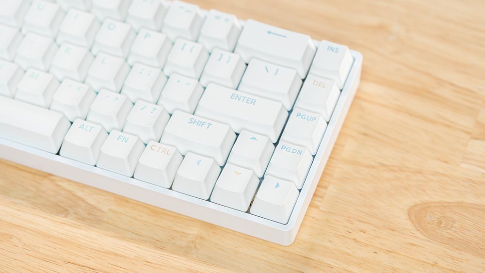 US配列の65%ファームファクターで、68キー。右ALTやCTRLなどは小さい1Uサイズになりますが、矢印キーやDelキーがギュッと隙間なく詰め込まれています。60%ではキー数的に満足できないけどコンパクトさも捨てたくない人におすすめ。