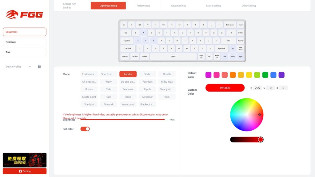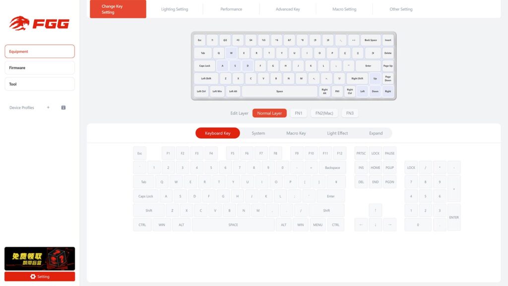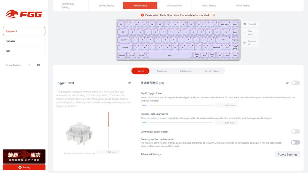 格安キーボードとしてはラピトリ0.04mm精度と、かなり頑張っています。アクチュエーションポイントに関しては0.1mmですが、いずれも0.02mm単位で細かく調整可能。