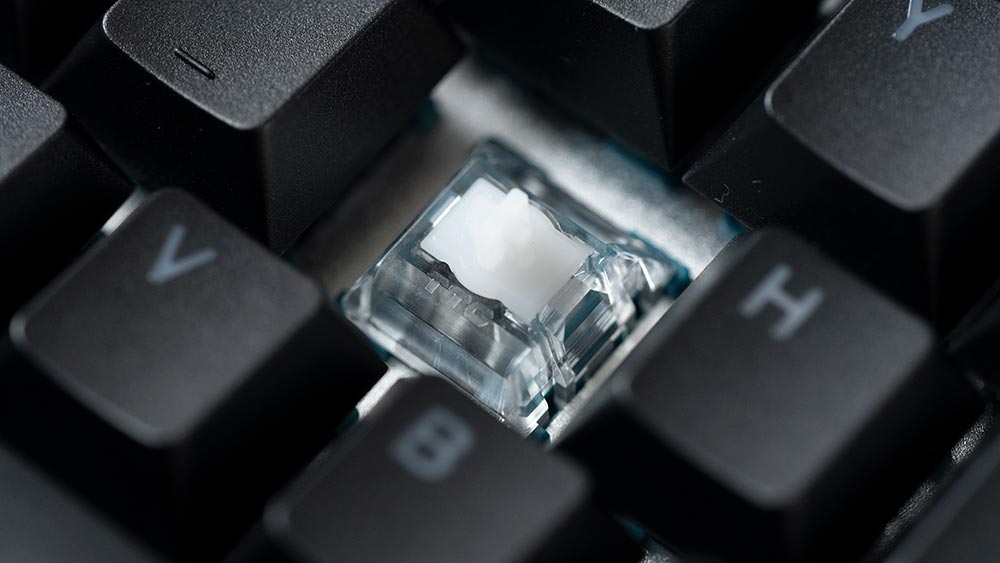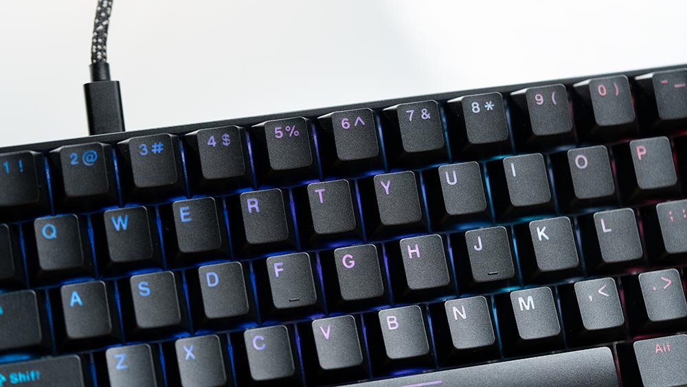 キーキャップはダブルショットPBT素材で、文字が透過処理されているのでRGBが光るタイプです。黒を使っても汚れは目立ちません。