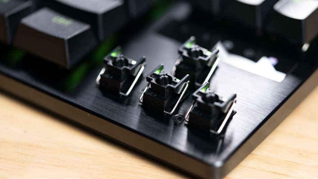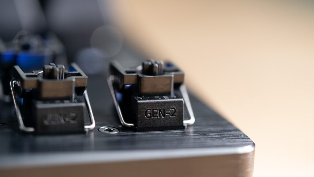 第2世代アナログオプティカルスイッチは、他のスイッチとは一線を画す独特な構造をしています。特にキーごとに配置されたスタビライザーのような構造が印象的です。