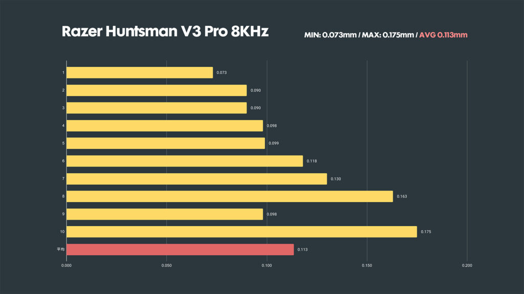 ラピッドトリガーを0.1mmに設定し、マイクロメーターを使った手動測定を行いました。あくまで手動のため、参考値です。