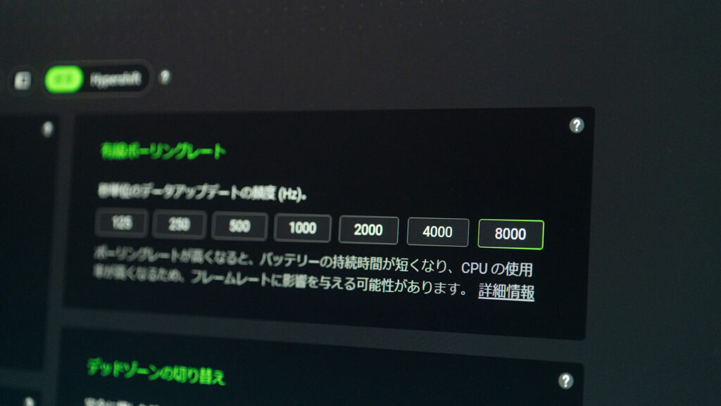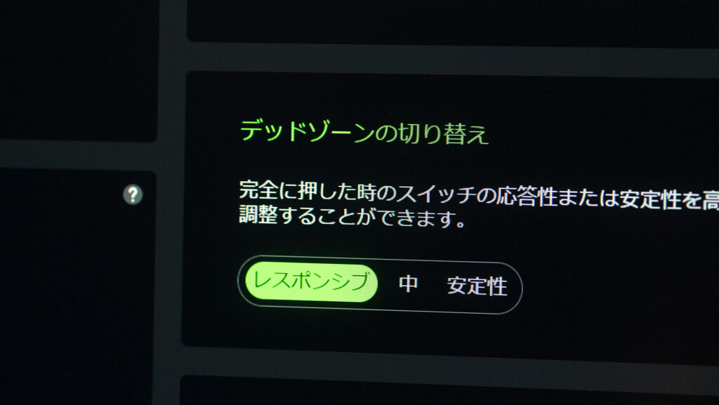 まずデッドゾーンの切り替えは3段階でシンプル。通常は0.1mm単位みたいな細かい数値で設定できますが、Razerはそこを非常にシンプルに削ぎ落としてきました。