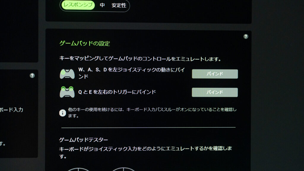 本機はアナログ入力に対応していますが、バインドもボタン1つ。すぐにスティック操作のようにキーを使えるようになります。カスタマイズの幅は少ないけど、とにかく分かりやすくて簡単。