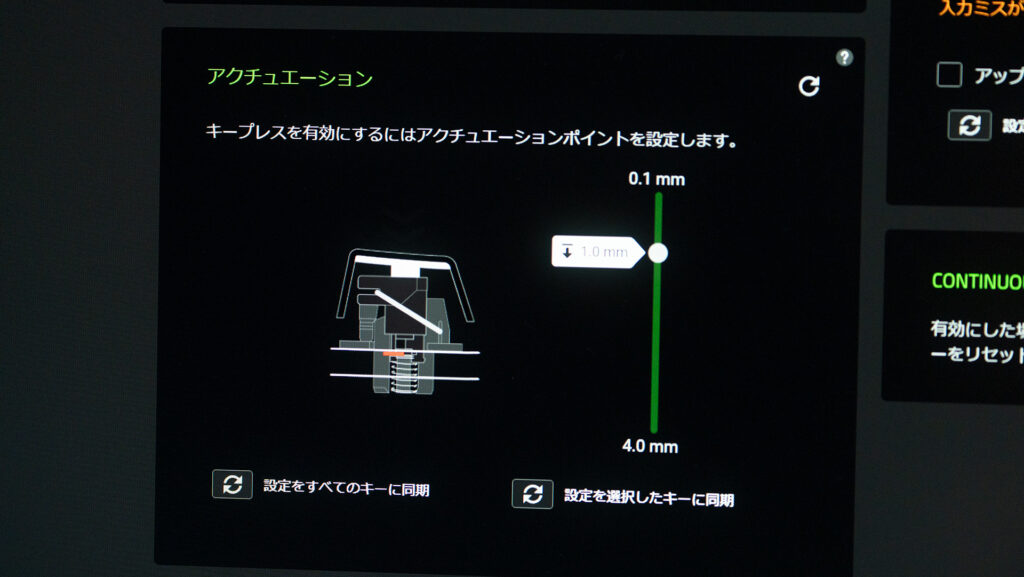 アクチュエーションポイントは0.1〜4.0mmまで。上記画像の緑に光っている縦のゲージ部分が押し込み具合をリアルタイムで表示するバーとなっています。深緑がニュートラル、押すと緑、リリースで赤に変化します。